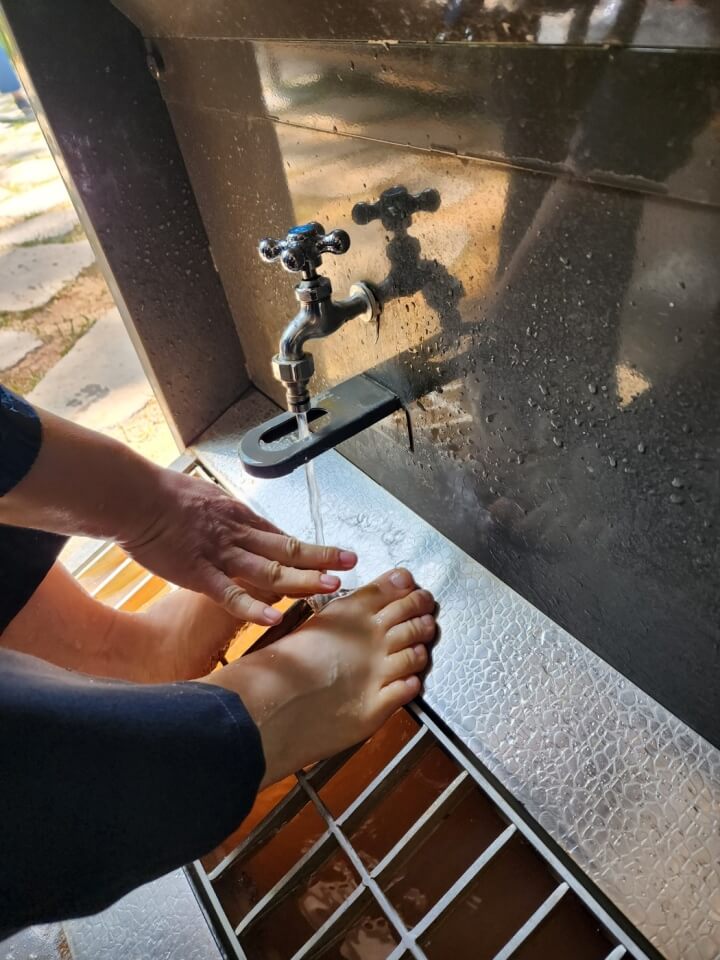 발을 깨끗하게 씻을 수 있는 세족장과 먼지를 털어낼 수 있는 기구가 함께 갖춰져 있습니다.